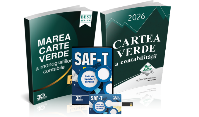 Achizitionati Pachetul format din SAF-T. Ghid de raportare corecta, Cartea Verde a Contabilitatii si Marea Cartea a Monografiilor Contabile la pretul total de 408 lei + TVA, redus cu 35% fata de pretul cumulat al celor doua lucrari de 627 lei + TVA!